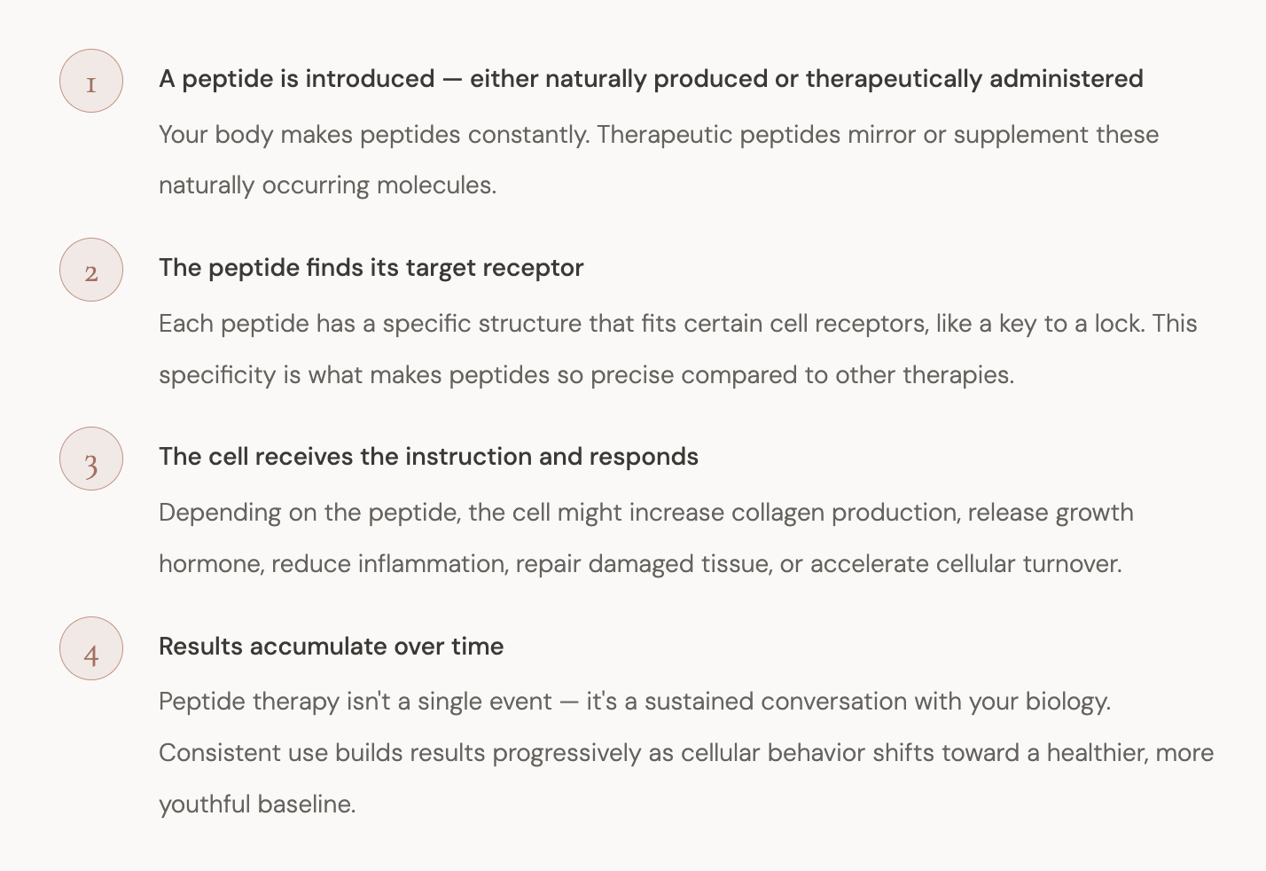 That small size is actually their superpower. Because peptides are compact, they can slip through biological barriers, bind to specific receptors, and deliver very precise instructions to cells. Think of them as biological text messages — short, targeted signals that tell your body what to do.