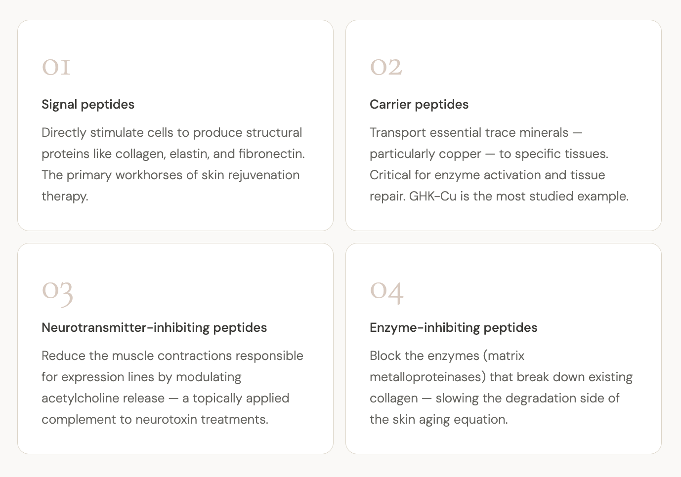 Not all peptides do the same thing. In clinical practice, therapeutic peptides generally fall into four broad categories, each with a distinct mechanism and application.